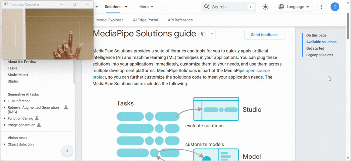 The stream is processed via the MediaPipe framework, extracting 21 distinct 3D hand landmarks in real-time for high-fidelity tracking.